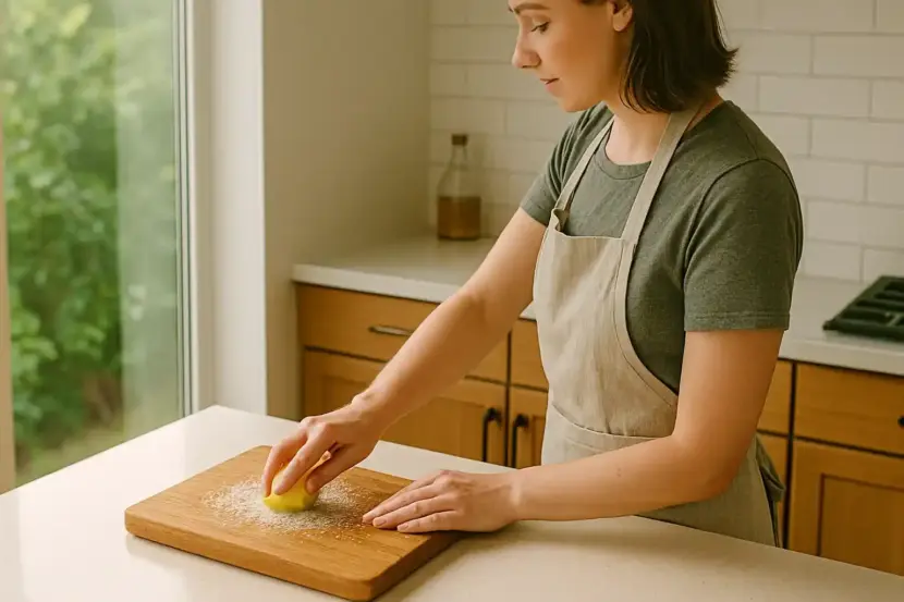 Quando o cheiro persiste mesmo após o uso de vinagre e limão, é sinal de que a limpeza precisa ser mais intensa. Polvilhe sal grosso e bicarbonato de sódio sobre a tábua, e use uma escova de cerdas duras ou o lado áspero da esponja para esfregar com força. O atrito ajuda a remover partículas impregnadas, enquanto o sal e o bicarbonato absorvem o mau cheiro. Deixe descansar por alguns minutos e enxágue bem.