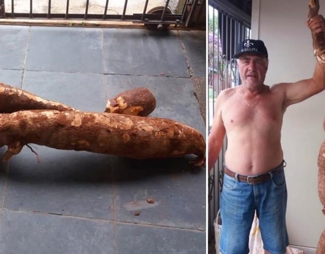 Um casal de moradores de Campo Limpo Paulista (SP) chamou a atenção após colher uma mandioca “gigante” em uma plantação. A raiz tem mais de dois metros de altura e pesa cerca de 30 quilos.