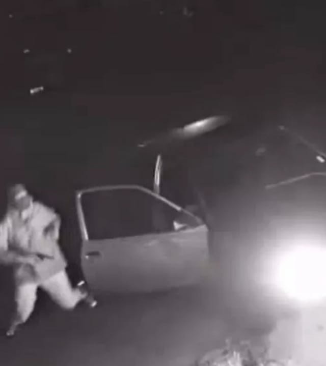 Dois homens descem desse segundo carro e correm em direção à casa, mas não chegam a tempo do portão se fechar por completo. Com isso, os criminosos começam a disparar tiros em direção ao portão. Logo, os homens voltam para o carro e fogem. Ninguém ficou ferido.