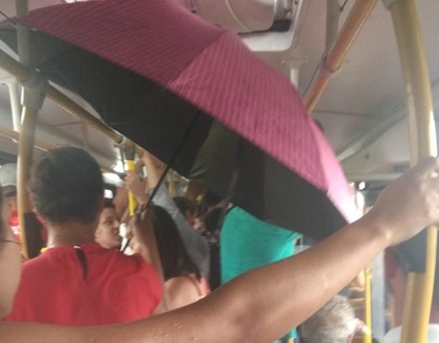 Uma passageira foi flagrada com um guarda-chuva em um ônibus ônibus intermunicipal que faz trajeto entre Jundiaí e Campo Limpo Paulista (SP). A cena inusitada foi registrada na quarta-feira (13) durante o temporal que atingiu a cidade e, rapidamente, viralizou nas redes sociais.