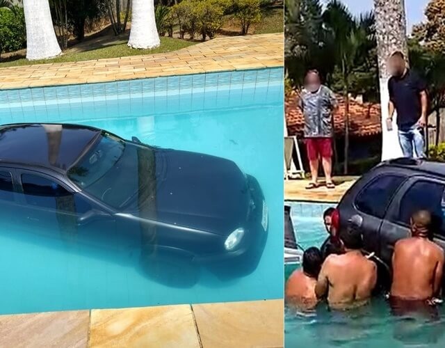 Já o carro foi retirado da piscina por um guincho e com ajuda de convidados. As informações são do Folha Notícias.