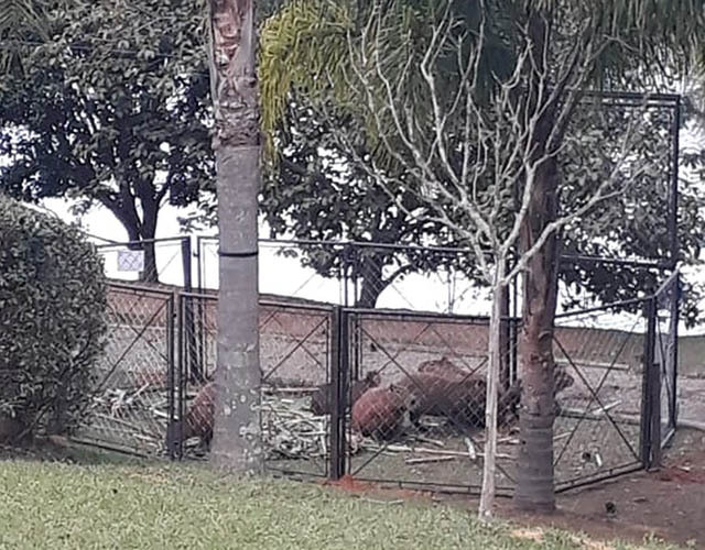 Fotos mostram os animais dentro de um cercado onde foram colocados pedaços de cana-de-açúcar.