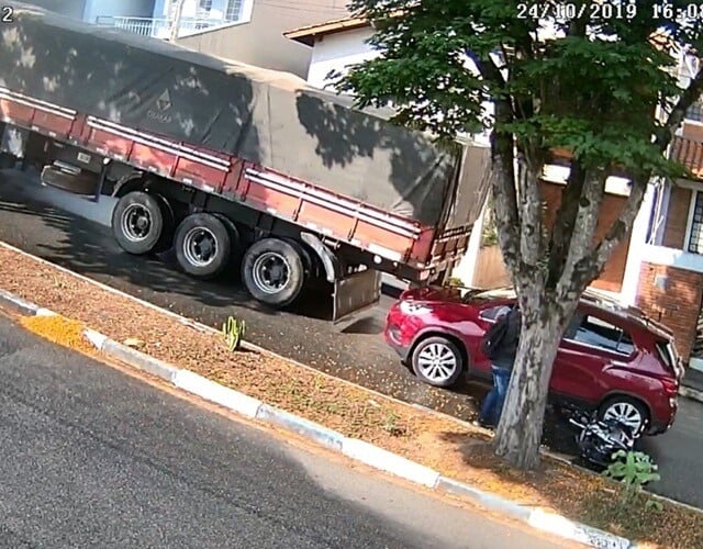 O veículo de carga voltou de ré e atingiu um carro e uma moto que estavam atrás, na Rua Dorival Mantovani. Uma câmera de segurança registrou o momento que a carreta atinge os carros.