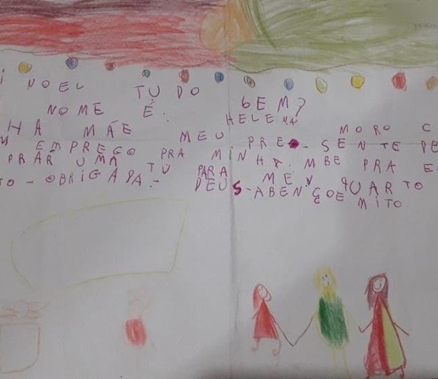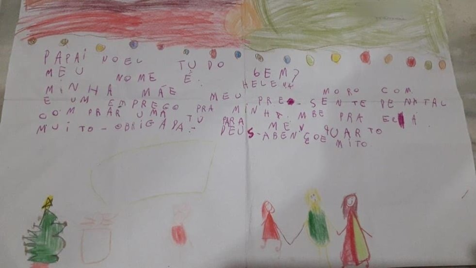 Ela também contou que o desenho na cartinha representa ela, a mãe e o Papai Noel. O mesmo desenho foi feito por ela na escola em que estuda e a pequena Helena fez o mesmo pedido na cartinha e chamou a atenção da professora.