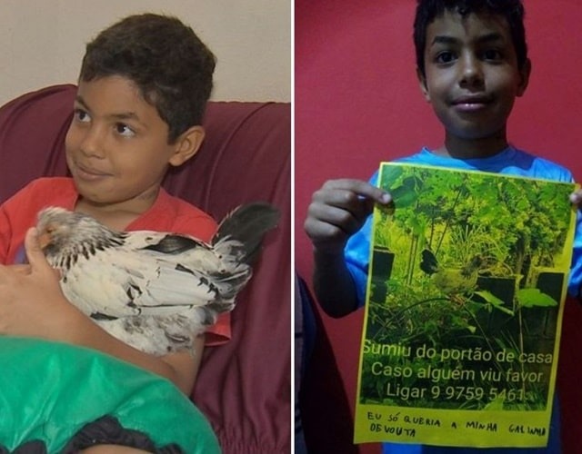 Com isso, o pequeno não ficou parado e, logo, providenciou um cartaz com a ajuda dos pais. Além disso, escreveu no papel com canetinha o seu maior desejo naquele dia: “Eu quero a minha galinha de volta”.