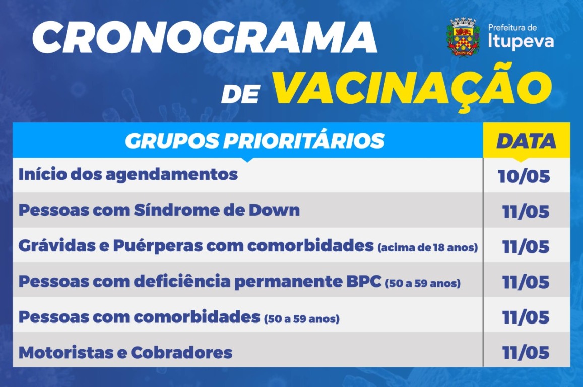 A Prefeitura de Itupeva anunciou que, com a atualização do Plano Nacional de Imunização, a vacinação contra Covid19 será disponibilizada para mais três grupos prioritários. Assim, a partir de terça-feira (11), imunossuprimidos, com síndrome de Down e em diálise poderão receber o imunizante.