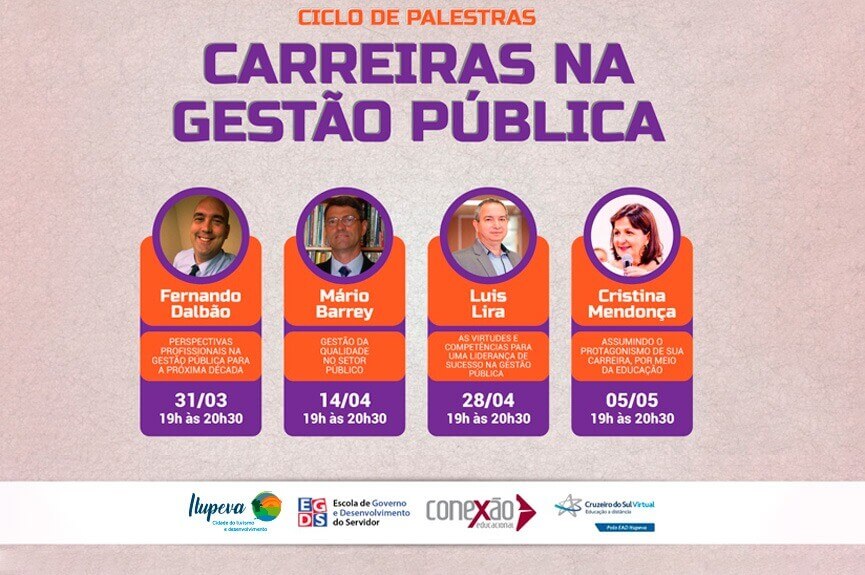 - 31/03, das 19 às 20h30: A palestra deste dia será ministrada por Fernando Dalbão, que abordará as perspectivas profissionais na gestão pública para a próxima década.