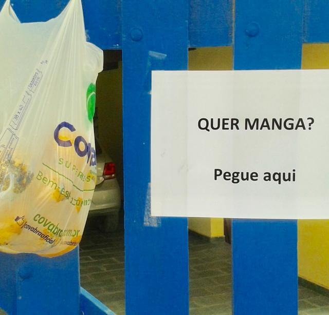 E é tudo bem simples: as alças da sacola são encaixadas na cerca e um papel impresso é colado bem ao lado, com os dizeres: “Quer manga? Pegue aqui”.