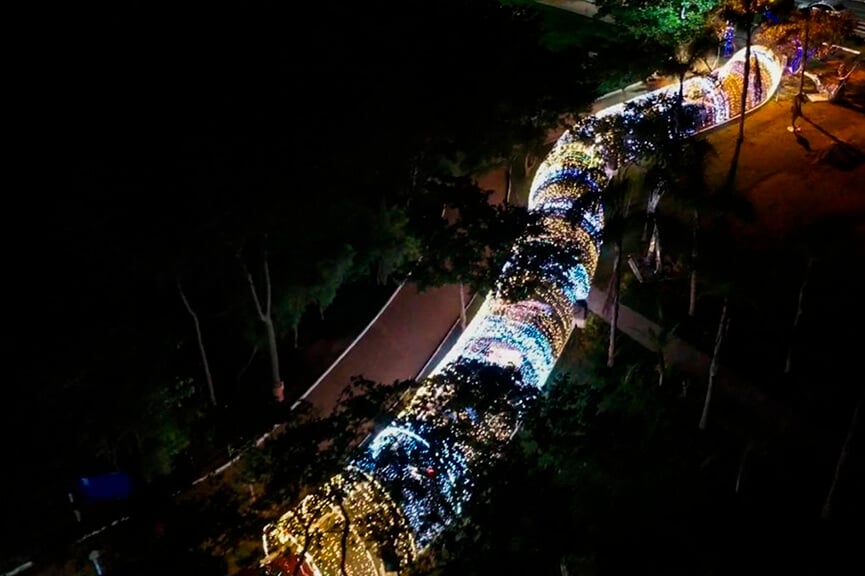 Durante o trajeto pelo túnel iluminado, os visitantes se encantam com as luzes coloridas, que formam as figuras de rena, trenó, entre outras, e a casinha do Papai Noel (com o Bom Velhinho e a Minnie).