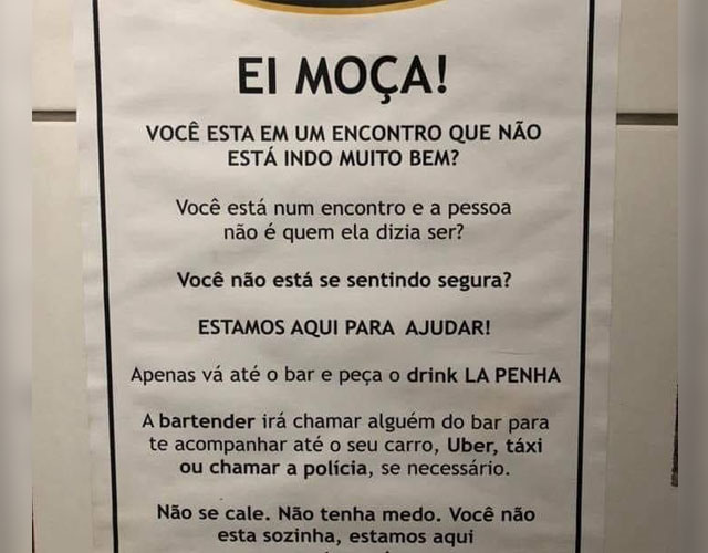 O cartaz está há quase um ano no bar e a ideia é simples: qualquer mulher que se sinta intimidada deve ir até o bar e pedir pelo drink La Penha. Com isso, o bartender chama alguém do bar que possa acompanhá-la até seu carro, Uber, Táxi ou, se necessário, chamar a Polícia.