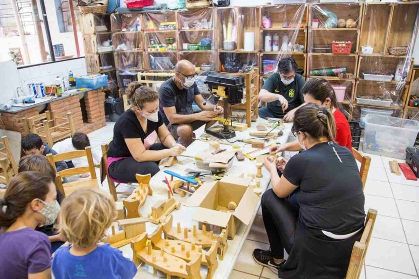 parceiros da escola e educadoras trabalham nesse ateliê para trazer vida nova aos