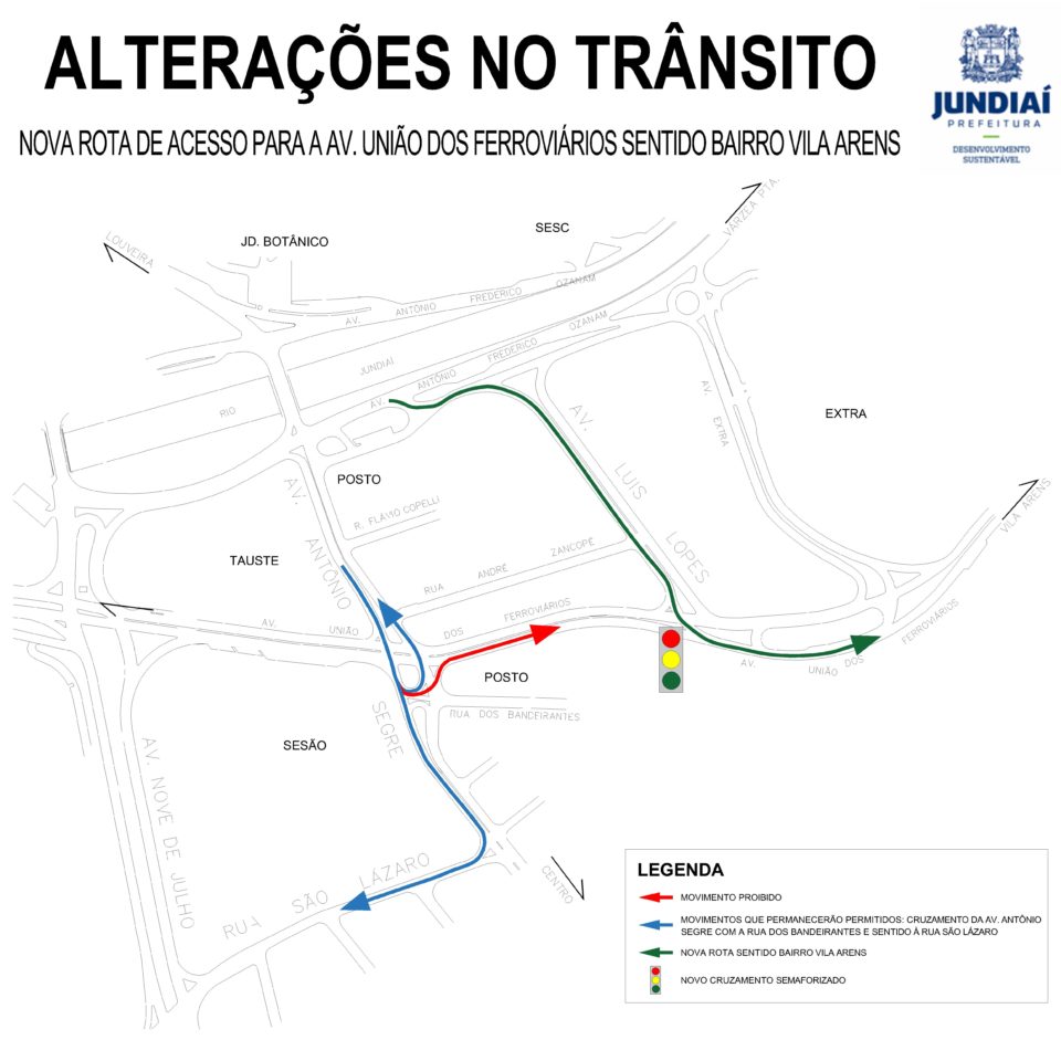 A Prefeitura de Jundiaí, através das unidades de gestão de Mobilidade e Transporte (UGMT) e de Infraestrutura e Serviços Públicos (UGISP), informa que o acesso da Av. Antonio Frederico Ozanam para a União dos Ferroviários, em direção à Vila Arens pela Av. Antonio Segre (junto ao cruzamento com a Rua dos Bandeirantes), será proibido a partir do dia 20 de janeiro.