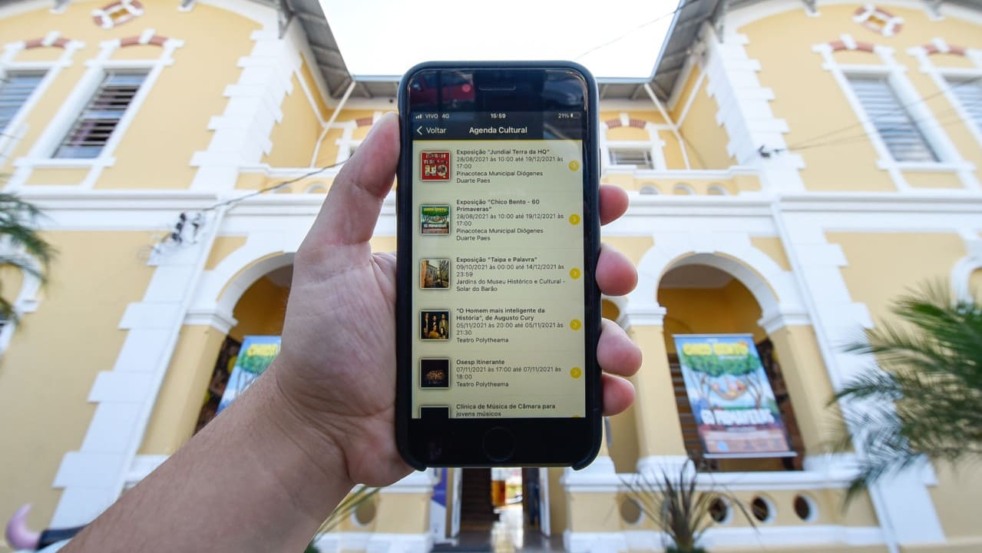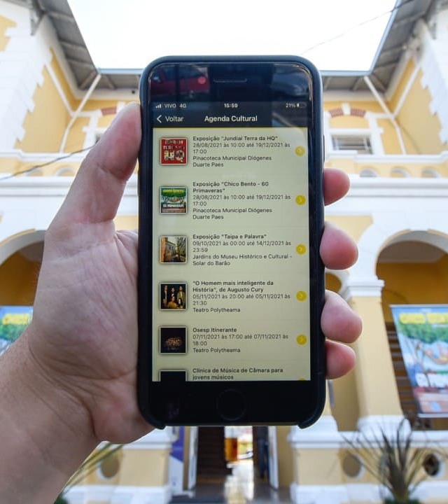 Para uma consulta gratuita e rápida, o Aplicativo Jundiaí conta com a agenda cultural dos equipamentos municipais, tendo a possibilidade de visualizar as exposições da Pinacoteca e do Museu Histórico e Cultural – Solar do Barão, os espetáculos do Teatro Polytheama, as atividades realizadas no Complexo Fepasa e as videotransmissões de atividades culturais nas redes sociais, entre outros.