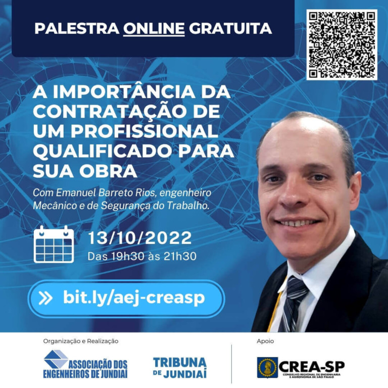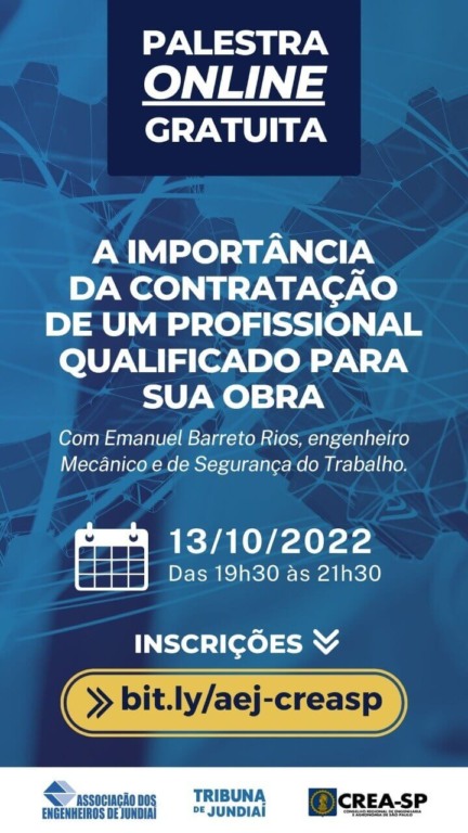 A palestra será online e gratuita, e acontecerá no dia 13 de outubro, das 19h30 às 21h30. Para se inscrever, basta acessar esse link https://bit.ly/aej-creasp. Para mais informações, entre em contato com a AEJ pelo telefone (11) 4586-3744 ou [email protected].