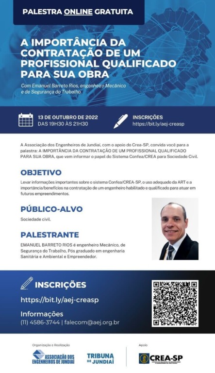 Na próxima semana, dia 13 de outubro, a Associação dos Engenheiros de Jundiaí, com o apoio do Crea-SP, promoverá a palestra: “A importância da contratação de um profissional qualificado para sua obra”. O conteúdo da palestra informará o papel do Sistema Confea/CREA para Sociedade Civil.