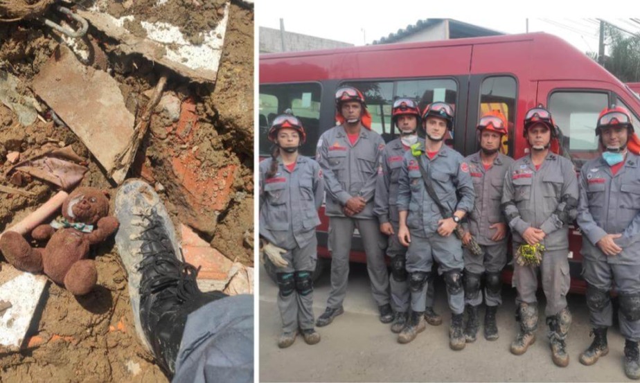 Além de retroescavadeiras, a busca por corpos também é realizada com o apoio de equipamentos de mapeamento, drones e da equipe do Canil. Para Vitor, essa é uma experiência que também auxilia em futuras ocorrências.