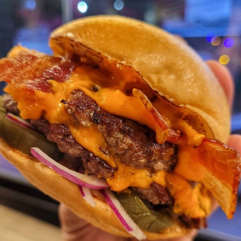 Lanche: Spicy é um Smashburger 100g, creme de cheddar, bacon, cebola roxa e jalapeño.