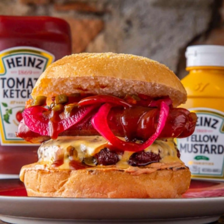Lanche: Black Dog é um Pão de milho, molho secreto, burger 150g defumado, american cheese, linguiça de costela defumada, picles cebola roxa, jalapeño em conserva e molho bbq da casa.