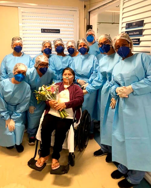 Na Unidade de Suporte Intensivo (USI), a alta de Izilda Maria Cordeschi, de 62 anos, foi celebrada pelos profissionais, que emocionados, falaram sobre a felicidade de ver mais uma paciente superando a Covid-19.