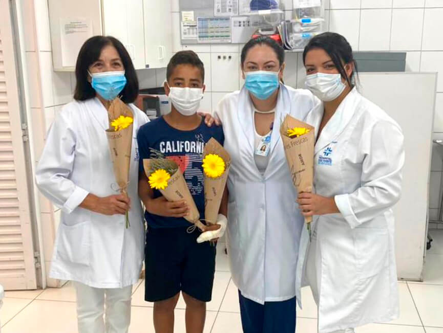 O paciente Matheus Joab Santana de Souza, de 12 anos, precisou de atendimento após cortar a perna na roda de uma bicicleta. Como forma de agradecimento pela assistência humanizada que recebeu, Matheus trouxe flores para as profissionais do Pronto Socorro de Ortopedia.