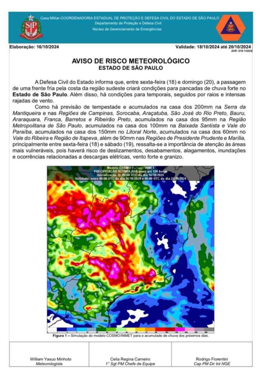 Nesta quinta-feira (17), a Defesa Civil do Estado emitiu um alerta para tempestades que afetarão todas as regiões de São Paulo, entre sexta-feira (18) e domingo (20), devido à passagem de uma frente fria pela costa do Sudeste.