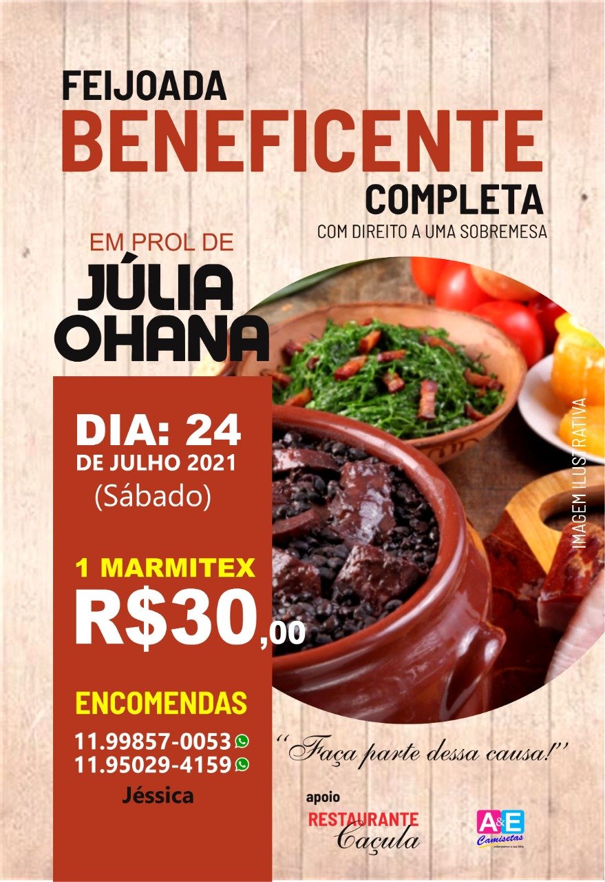 Mais uma ação beneficente foi organizada para ajudar a custear o tratamento de saúde da jovem Julia Ohana Conceição Rafael, 16 anos. Uma feijoada completa, com direito à sobremesa, foi organizada pela mãe da garota, Jessica Sartori, para o próximo dia 24 (sábado). As encomendas já estão sendo feitas.