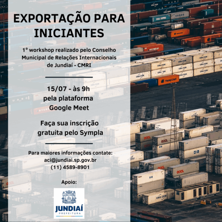 O Conselho Municipal de Relações Internacionais (CMRI) promove o 1º Workshop para Iniciantes na Exportação, no dia 15 de julho, às 9h. O tema será “Conhecimento de Mercado” e o Conselho apresentará uma ferramenta gratuita para identificar o melhor mercado para seu produto.