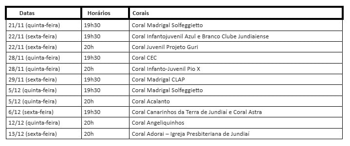 A segunda apresentação na sexta-feira (22), às 19h30, traz o Coral Infantojuvenil Azul e Branco do Clube Jundiaiense com um repertório dedicado às crianças de 6 a 14 anos, com canções do folclore brasileiro e de Natal. Na sequência, às 20h, sobe aos palcos o coral juvenil do Projeto Guri, formado por alunos e alunas de 12 a 17 anos, com músicas natalinas sob a regência do educador Tiago Souza e da pianista Sheila Costa.