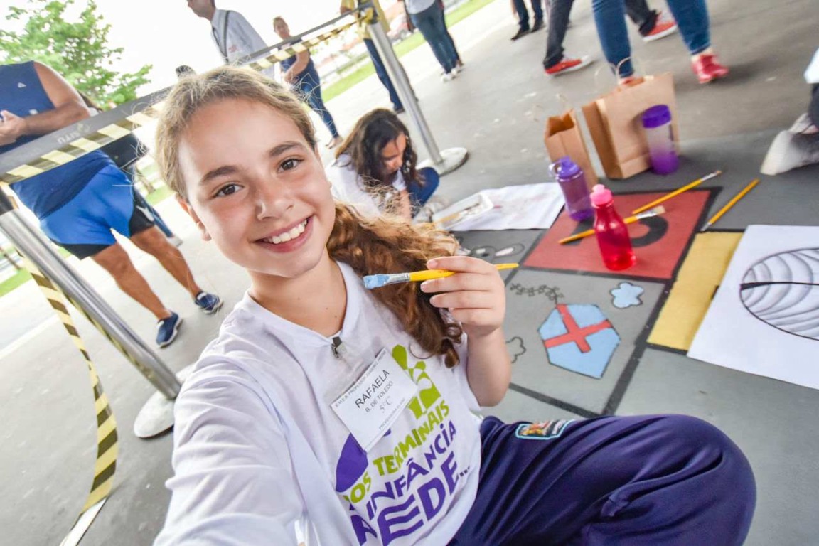 Após dias de preparação e muito trabalho, as crianças da rede municipal de ensino puderam expressar toda a criatividade e levar cores e marcas das suas infâncias aos terminais rodoviários da cidade. Esse é o projeto “No Terminal a Infância Pede…”, que reuniu 170 crianças para pintar amarelinhas, em oito terminais rodoviários, para transformar os espaços públicos em espaços de brincar, enquanto esperam para embarcar no ônibus.
