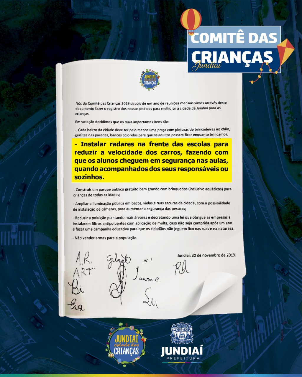 O Comitê das Crianças solicitou a instalação de radares na frente das escolas. O pedido faz parte do documento divulgado pela Prefeitura de Jundiaí, na última sexta-feira (10).