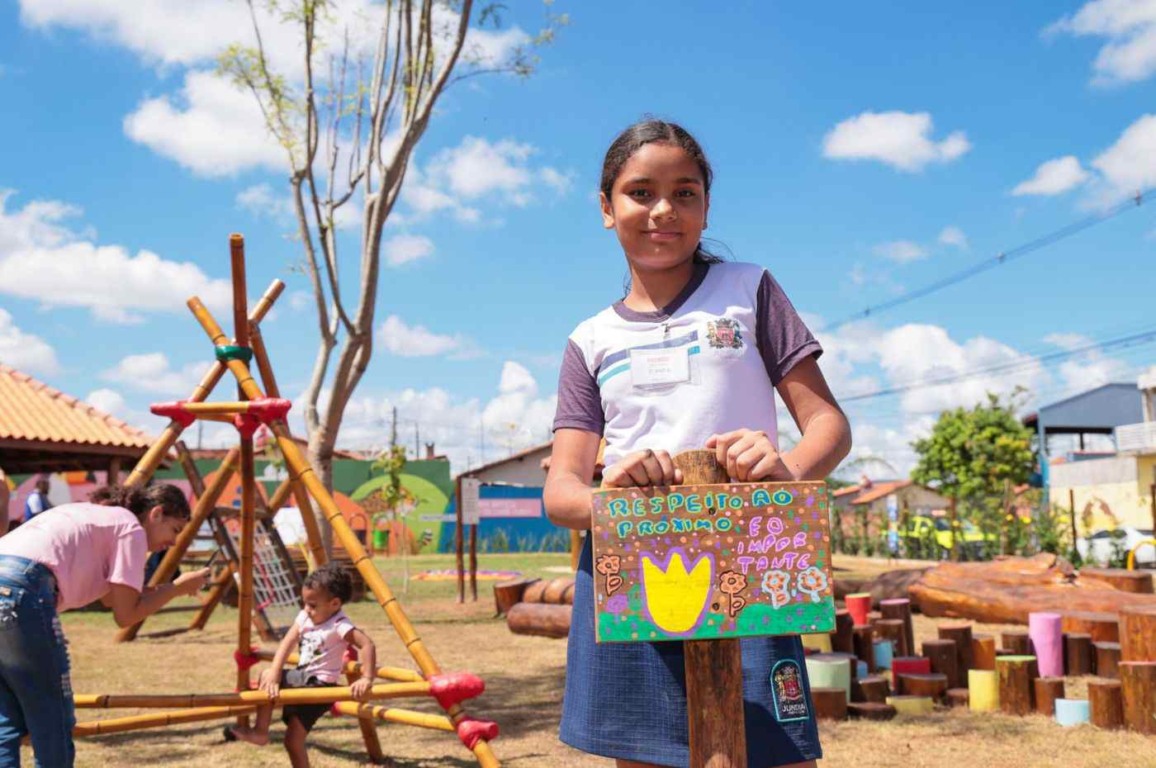 A Brenda Gomes, de dez anos, é estudante do 5º ano da Emeb Beatriz e participou da oficina de pintura das placas com a identidade da campanha Pé de Infância. “Quis deixar registrado que ‘Respeito ao próximo é importante’, para que as pessoas não pensem apenas em si mesmas e porque vir brincar aqui e preservar o espaço é um sinal de respeito.”