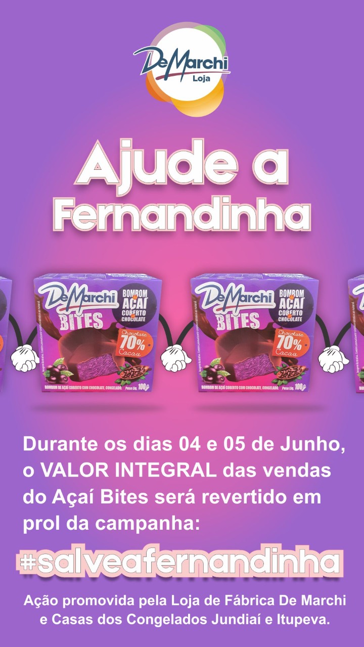 Nos dias 4 e 5 de junho, a empresa irá reverter todo o lucro das vendas do Açaí Bites para a campanha #SalveAFernandinha. A ação será válida e promovida pela Loja de Fábrica De Marchi e a Casas dos Congelados de Jundiaí e Itupeva.