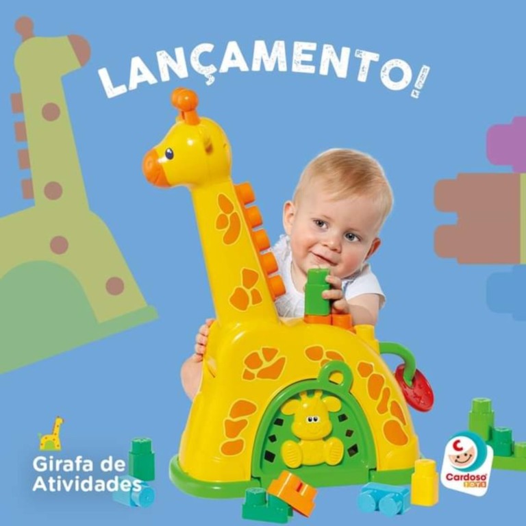 A girafa de atividades infantil é um centro de atividades musicais com 15 blocos. Possui pescoço articulado, espaço interno para guardar os blocos, espaço no pescoço e lombo para encaixar os blocos e completar sua girafa.
