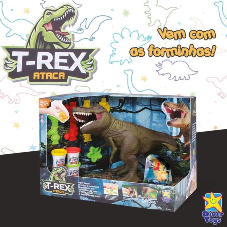 O Boneco Dinossauro T-rex Ataca acompanha massinhas e forminhas em formato de dinossauro para que ele possa comer os dinossaurinhos feitos de massinha.