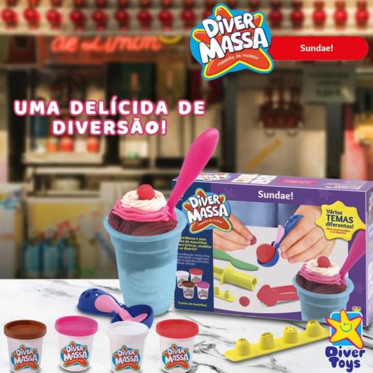 Com esse kit de massinha a criança pode fazer várias criações de sundaes e sorvetes de massas divertidas. Uma brincadeira muito legal que estimula a criatividade e imaginação dos pequenos. O kit contém: 4 potes de massinha + 10 super acessórios.