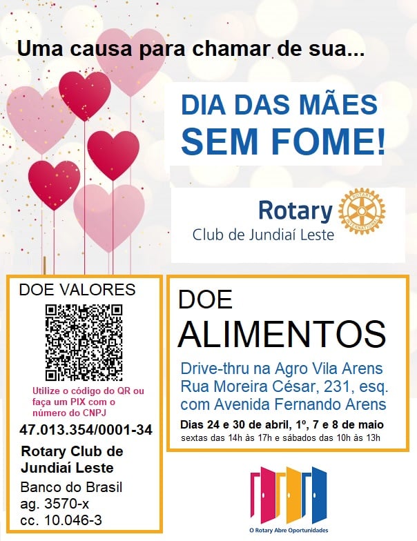 Para comemorar o Dia das Mães e garantir a refeição das famílias que se encontram em situação de vulnerabilidade social, a equipe do Rotary Club Jundiaí Leste inicia a campanha ‘Uma causa para chamar de sua: Dia das Mães sem fome’, que consiste em arrecadar qualquer tipo de alimento para organizar cestas básicas.