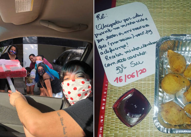 Em isolamento com o marido e respeitando as regras de distanciamento, ela sabia que seria impossível reunir os mais próximos. Decidiu então em separar o melhor de uma festa de aniversário e levar, com toda a segurança, até seus convidados. De casa em casa. De família em família.