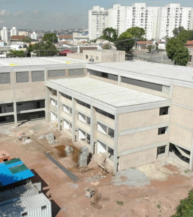 Em ritmo acelerado, também foram instalados elementos translúcidos (que permitem a passagem da luz) da quadra coberta interna do prédio. Enquanto que na área externa, há a execução da fundação do reservatório elevado de concreto armado, muros de divisa e arrimo, drenagem e tubulação de água. Ainda faltam a pintura e a terraplanagem da praça lateral (a ser revitalizada).