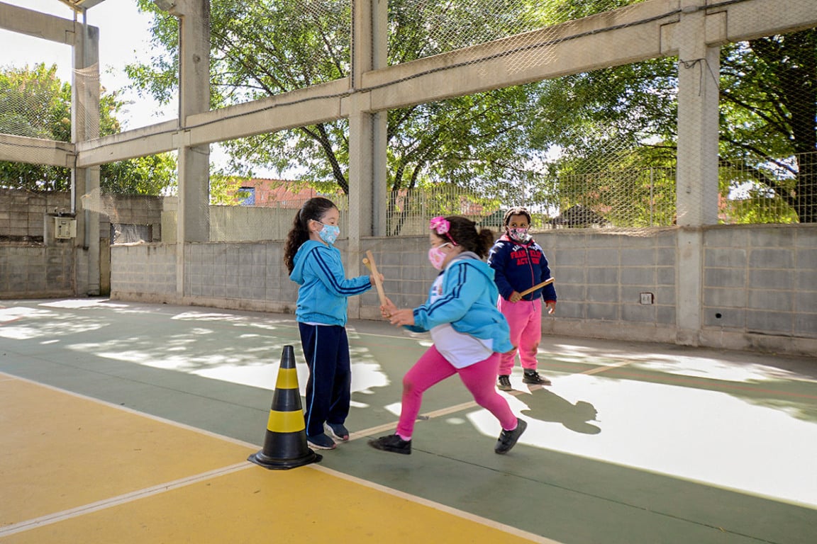 No parquinho, montaram um circuito com barreiras, para provas de agilidade e corrida. O espaço contou com uma faixa de chegada e bandeiras das cores do símbolo das Olimpíadas. “Montamos estações e modalidades que não precisam da manipulação de equipamentos e, no caso do revezamento, cada criança usa seu bastão, evitando que passem de um para o outro”, explicaram os professores, Eliana Molena e Luís Alfredo Martins Ferreira, especialistas de Educação Física.