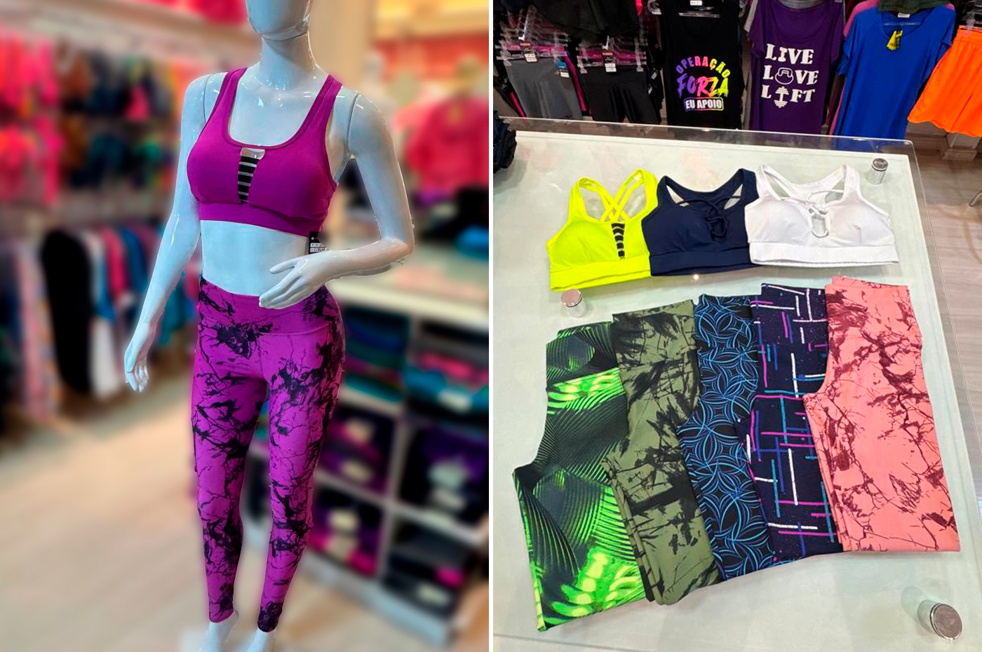 - Top Fitness em várias cores, de R$49,90 por R$34,90 – e duas peças saem por R$59,90.