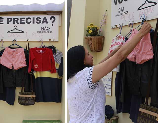 Com os dizeres “Você precisa? Sim: pegue uma peça. Não: doe uma peça”, o cabide solidário está sempre com peças de roupas e é abastecido diariamente por Irene Vieira, dona do brechó Achou Família, do outro lado da rua.