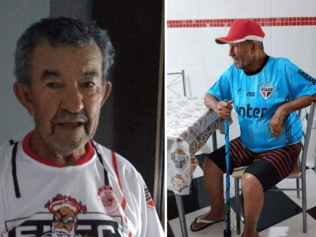 Morador da Vila Ana, o idoso está vestindo uma camiseta azul do São Paulo; a blusa de frio e calça são pretas. Ele pode estar usando um pedaço de madeira ou bengala como apoio.