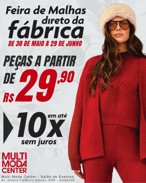 O frio chegou de vez à região de Jundiaí, e com ele, uma oportunidade imperdível para renovar o guarda-roupa gastando pouco. A Feira de Malhas do Multi Moda Center começa nesta sexta-feira, 30 de maio, reunindo opções de roupas de frio direto de fábrica e para todos os estilos, idades e bolsos.