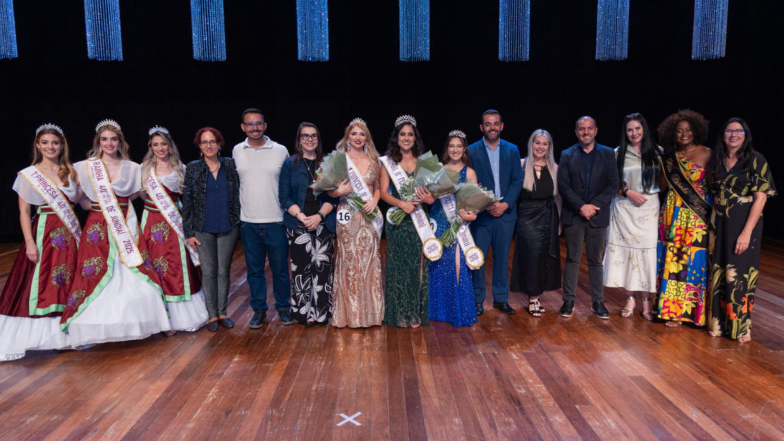 A Corte da Uva 2025 também participou da noite, com Beatriz Vioti Zuim (rainha), Maria Júlia da Silva (1ª princesa) e Larissa Diogo Souza (2ª princesa), além da Miss Pérola Negra 2024, Alissa Galdino.