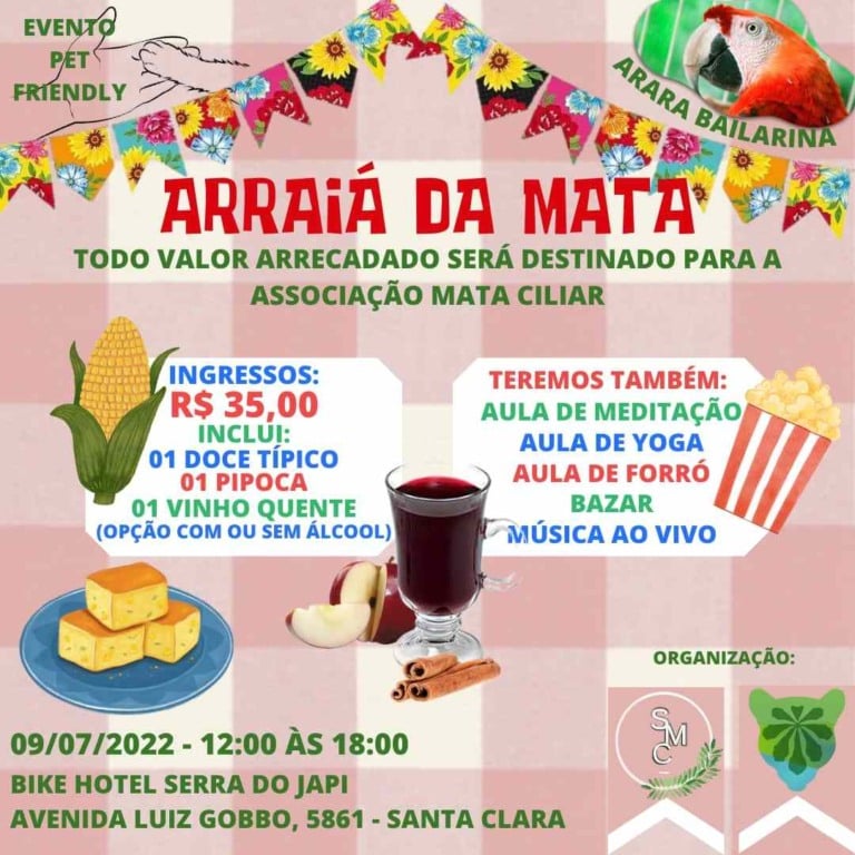 Será realizado no próximo sábado (9) o Arraiá Vegano da Mata, em prol da Associação Mata Ciliar. A festa será no pé da Serra do Japi, e vai contar com comidas típicas, bingo, aulas de forró, yoga e meditação, atividades de educação ambiental para crianças, quadrilha e brincadeiras juninas como pesca, cadeia e correio elegante, tudo tendo como tema o Meio Ambiente.