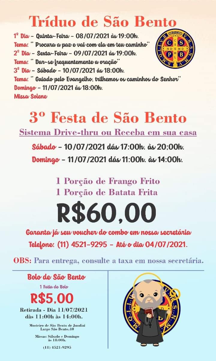 A tradicional Festa de São Bento, em Jundiaí, terá a terceira edição de uma maneira diferente. Até domingo (4), será possível retirar vouchers do combo de frango e batata frita na secretaria da paróquia, para a festa – marcada para os próximos dias 10 e 11 (sábado e domingo).
