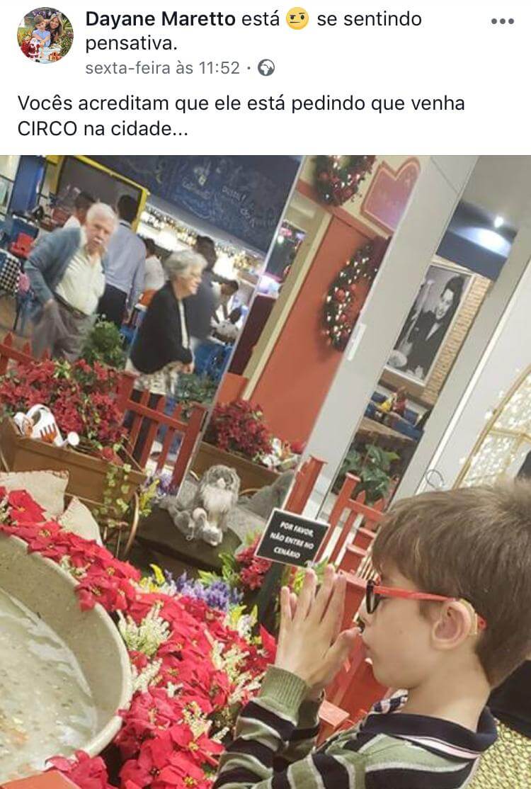 Desde pequeno, João Pedro Maretto, de 9 anos, ama circo e, principalmente, palhaços. Na última sexta-feira (30), a mãe dele, Dayane Maretto, postou nas redes sociais uma foto do João fazendo uma prece junto à fonte instalada na decoração de natal do JundiaíShopping. Com fé, ele pedia para que algum circo viesse para Jundiaí. Pedido esse que foi rapidamente respondido: três dias depois foi anunciada a chegada do Circo Stankowich à cidade.