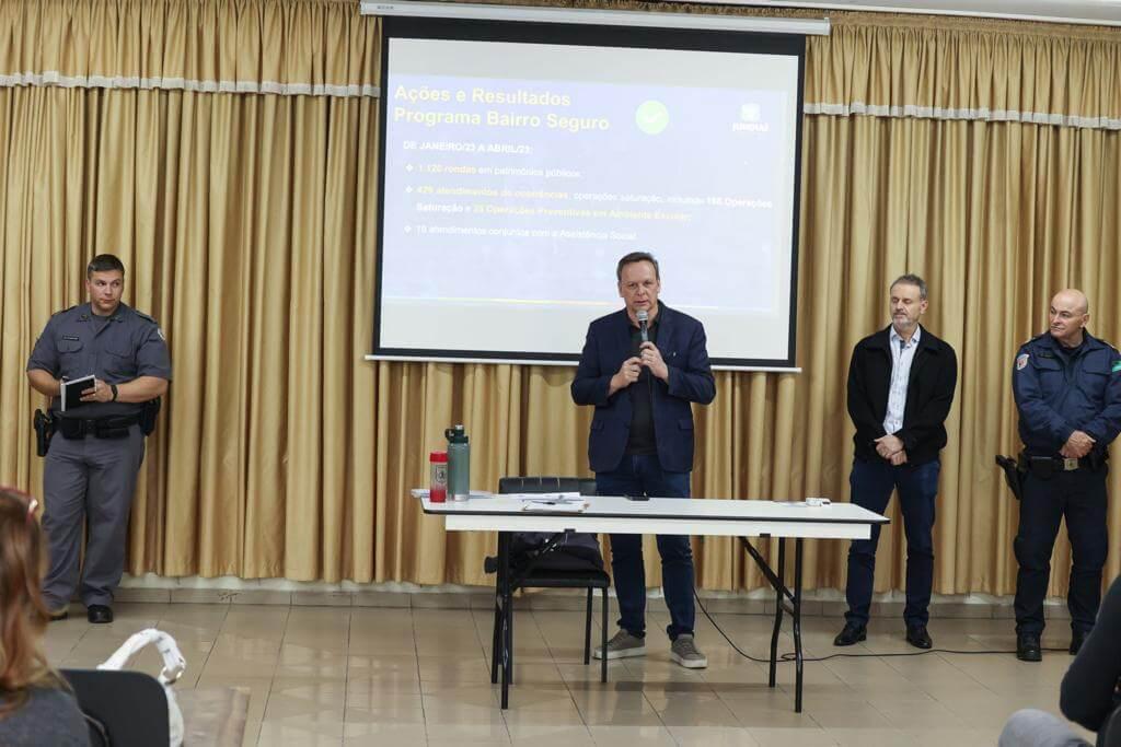 Na noite desta quarta-feira (17), gestores municipais e autoridades de segurança se reuniram com os moradores da região da Ponte São João. A reunião, solicitada pela vereadora Quézia de Lucca, prestou contas sobre as ações voltadas ao tema. O Gestor de Governo e Finanças, José Antonio Parimoschi, representou o Prefeito Luiz Fernando Machado.