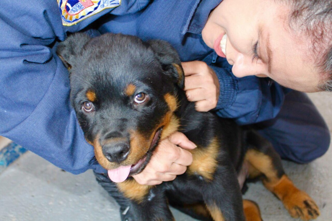 São quatro novos cães em treinamento: 2 pastores belgas malinois, a Kira, de 6 meses, e o Logan, de 1 ano e 1 mês; uma labradora, a Pandora, de 1 ano e três meses; e o mais novo de todos, o rottweiler Hammer, de dois meses.