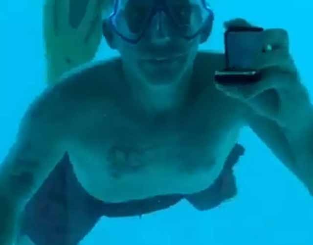 Mais adiante no vídeo, Weber vira a folha de papel para revelar o pedido, tira um anel de noivado do short e sai nadando.
